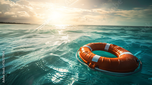 Life bouy floating on ocean surface , safety equiment for boat and ship concept .