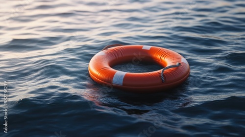 Life buoy bobbing gently in calm waters, with the waves gently lapping at its sides.