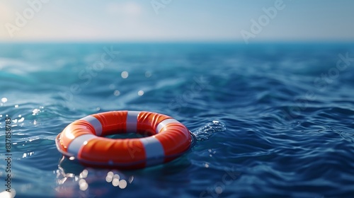 Life buoy floating on calm ocean water with clouds