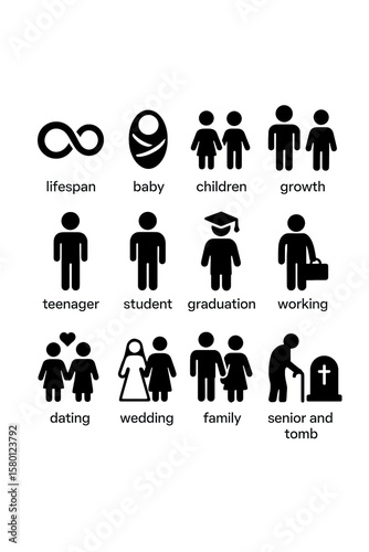 Life cycle icon set. Lifespan, baby, children, growth, teenager, student, graduation, working, dating, wedding, family, senior and tomb. Solid vector icons collection