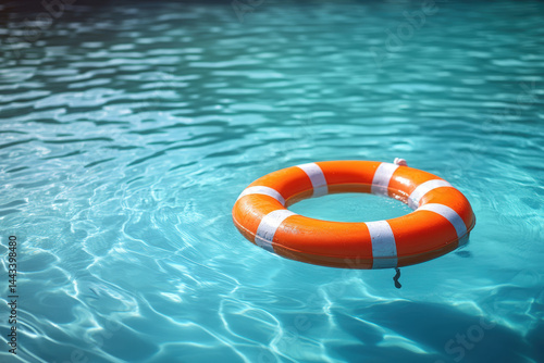 Life Preserver Floating in Pool. A vibrant orange life preserver floats serenely on the surface of a crystal-clear swimming pool, perfect for summer relaxation and safety.