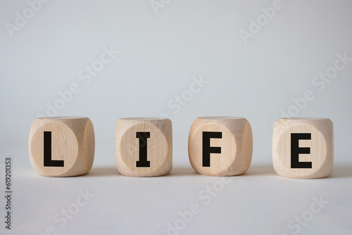 Life symbol. Concept word Life on wooden cubes. Beautiful white background. Business and Life concept. Copy space.