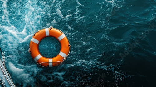 lifebuoy attached to a boat, with the bright orange circle contrasting with the deep blue sea, showing the boat readiness for any situation.