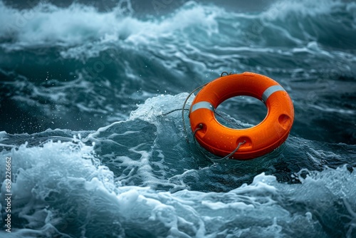 Lifebuoy in a turbulent sea: A dramatic scene of a bright orange lifebuoy bobbing in the rough, churning waves of a stormy sea, symbolizing hope and rescue amidst the chaos of the ocean