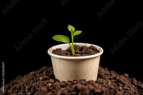 Life's Gentle Beginning: A single, vibrant sprout emerges from rich soil, cradled in a rustic pot, symbolizing growth, renewal, and the delicate beauty of nature against a simple background.
