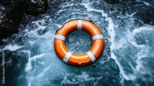 Lifesaver ring floating on turbulent water nature scene safety equipment aerial view emergency preparedness