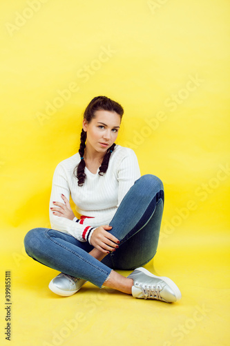 lifestyle people concept: pretty young school teenage girl having fun happy smiling on yellow background