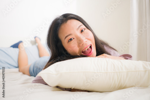 lifestyle portrait of young and beautiful Asian woman at home - attractive and happy Chinese girl gesturing playful and cheerful on bed smiling relaxed