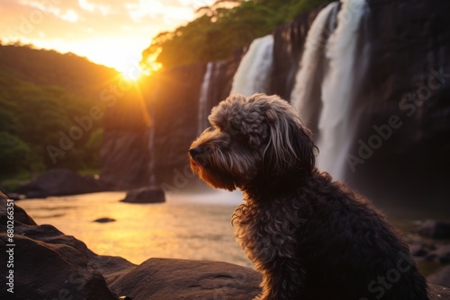 Lifestyle portrait photography of a funny poodle watching a sunset against waterfalls background. With generative AI technology