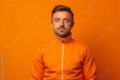 Lifestyle portrait photography of a glad boy in his 30s wearing a comfortable tracksuit against a tangerine orange background. With generative AI technology