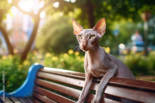 Lifestyle portrait photography of a happy oriental shorthair cat investigating against a picturesque park bench. With generative AI technology