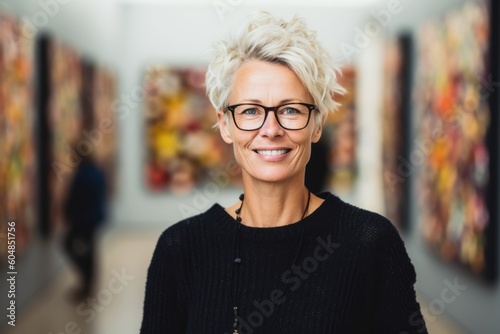 Lifestyle portrait photography of a tender mature girl wearing a cozy sweater against a modern art gallery background. With generative AI technology