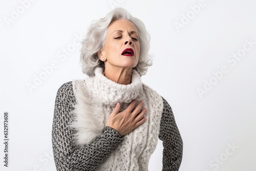 Lifestyle portrait photography of a woman in her 40s coughing with discomfort due to pneumonia wearing a chic cardigan against a white background