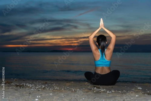 Lifestyle woman yoga exercise and pose for healthy life. Young girl or people pose balance body vital zen meditation for workout nature background