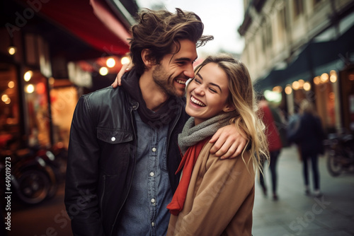 Lifestyles, relationship and multicultural concept. Happy young and beautiful couple walking in city. Joyful mood. Cityscape in background. Autumn weather. Generative AI
