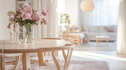 Light, airy dining room with a round wooden table, pink flowers, and natural light. A view of a living room is visible through the space