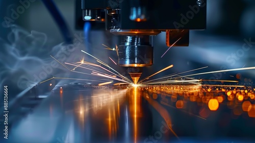 Light and sparks from laser CNC cutting of metal, technology modern industry
