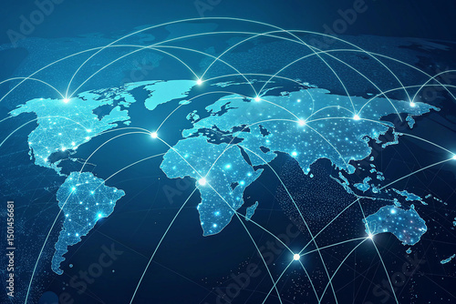 light blue background with a digital world map and global network connections, representing the concept of international business or connectivity