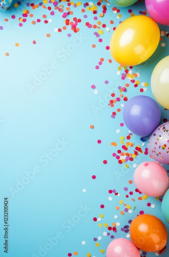 Light blue background with colorful party decorations on the right side, including confetti and balloons