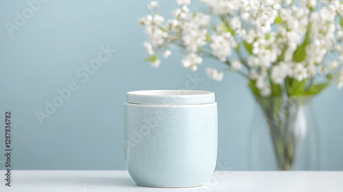 Light blue ceramic cup and lid on a white table, flowers in background. Suitable for product photography or lifestyle imagery