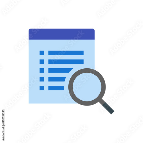 Light blue document with dark blue header and list items and a grey magnifying glass overlaying the list