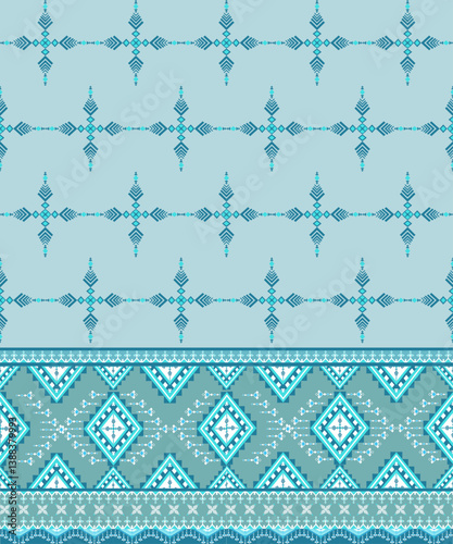 Light Blue Geometric Textile Pattern: Intricate Diamond & Cross Motifs with Decorative Border - Fabric Design, Ethnic Print, Surface Pattern, Textile Art