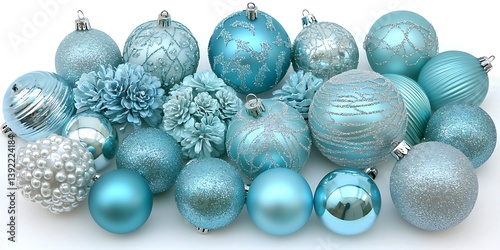 Light blue ornaments on white background for holiday decorations, cards or advertising