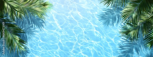 Light blue water background with palm leaves and ripples, swimming pool water, light aquamarine, tropical beach