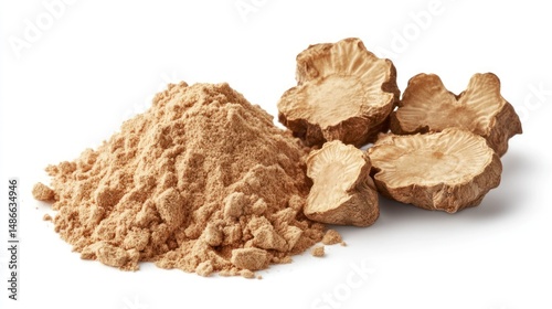 Light brown herbal powder and dried root slices on white background