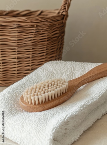 Light brown wooden brush resting on white towel, next to wicker basket