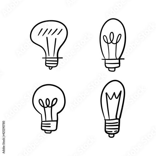 Light bulb doodle collection. Set of hand drawn electric lamp. Symbol of idea, innovation and solution.