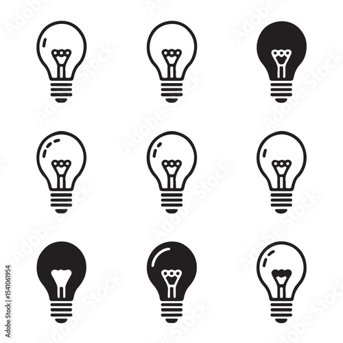 Light Bulb Icon Set Collection. Nine Simple Black and White Lightbulb Icons