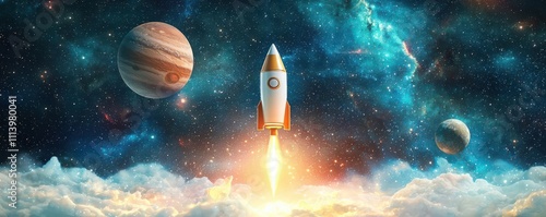 Light bulb rocket traveling through space, stars and planets in the background, infinite creativity, 3D rendering