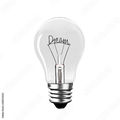 Light bulb with Dream word wire shape, isolated on white background, front view, 3D rendering.