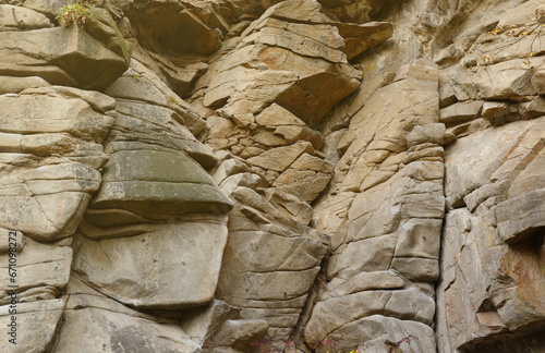 Light coarse natural rock stone background. Mining cliff rough front surface. Big limestone stack backdrop. Heavy grunge damaged granite block texture. Crack antique medieval stony facade for design