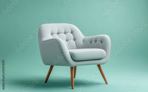 Light gray armchair with button tufting on a teal background. The chair has wooden legs and a soft, textured fabric