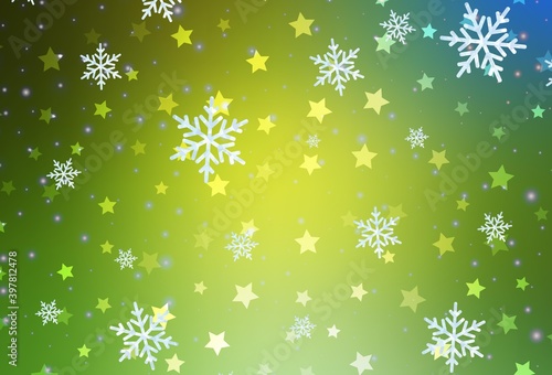 Light Green, Yellow vector texture with colored snowflakes, stars.