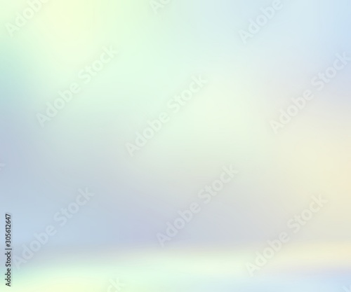 Light holographic room 3d render. Pearl glow empty background. Pastel yellow blue green gradient. Empty wall blurred texture. Flat floor. Wonderful subtle template.