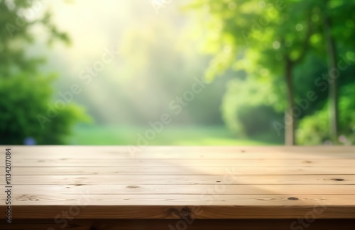 Light oak wood table surface in garden setting. Minimalist soft fog filled garden with cool white lighting, gentle green tones. Copy space available on table. Perfect for product, showing fresh