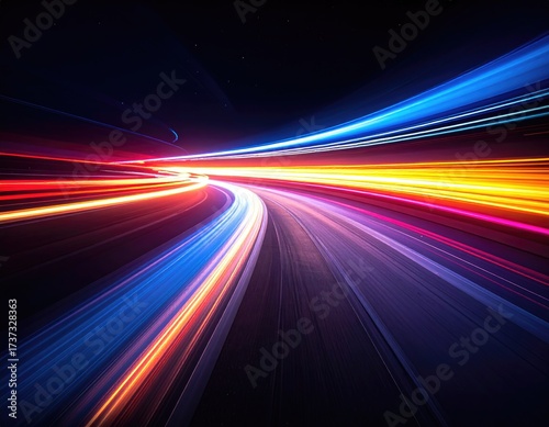 Light streaks blur on a road speeding into dark distance