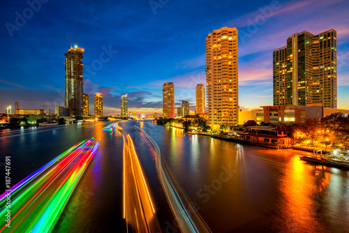 Light trails of traffic on the Chao Phraya river, Bangkok. Thailand. view from Taksin bridge Bangkok