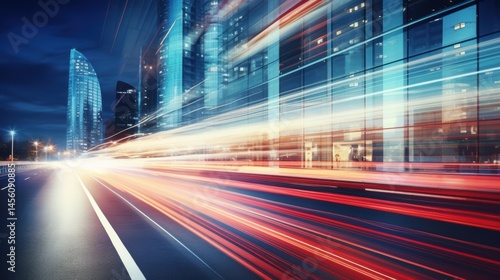 Light trails on the modern building background. Light trails at night in urban environment, Abstract Motion Blur City, traffic, transportation, street, road, speed.