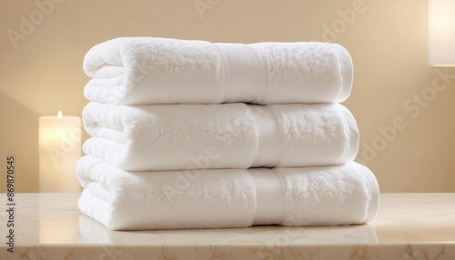 Light white spa towels pile, bath towels lying in a stack on light white peaceful background, at hotel, ad shot, copy space for text, decorative presentation