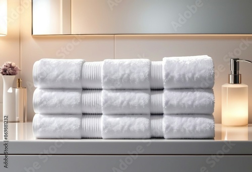 Light white spa towels pile, bath towels lying in a stack on light white peaceful background, at hotel, ad shot, copy space for text, decorative presentation