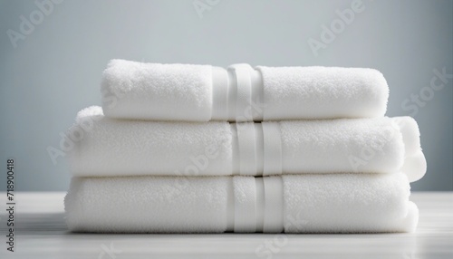 Light white spa towels pile, bath towels lying in a stack on light white peaceful background with copy space