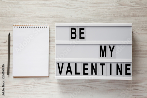 Lightbox with text 'Be my Valentine', blank notepad over white wooden surface. Valentine Day 14 February.