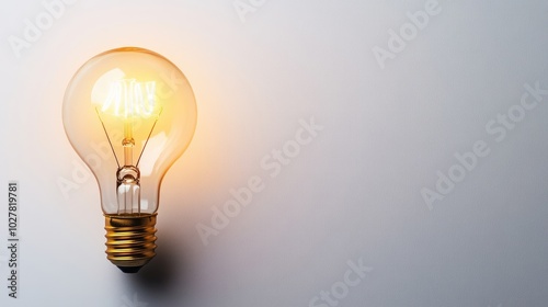 Lightbulb with a subtle illumination on a white background, large area for text placement
