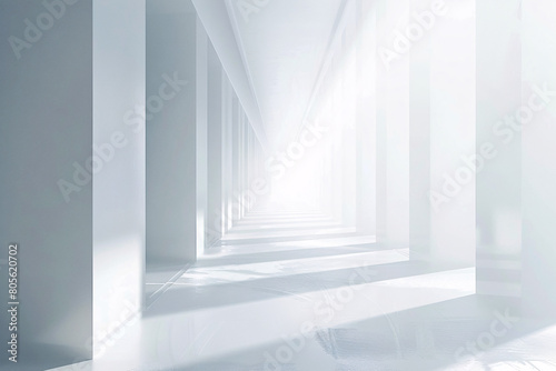 light-filled corridor with white walls and columns, leading to a bright opening, creating a sense of endless space and tranquility