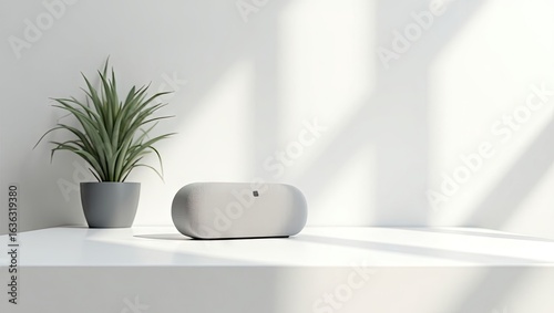 Light-filled modern room with a plant and audio device.