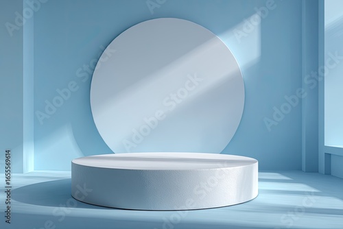 Light-filled, pale blue room with white circle and pedestal